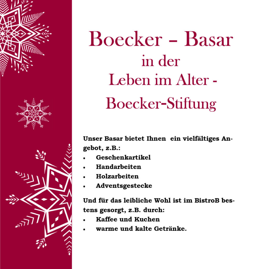 Die Boecker-Stiftung wurde 1970 von den Wittener Textilkaufleuten Emilie und Gregor Boecker gegründet. Ihr Ziel war es, ihren Nachlass zum Wohl anderer einzusetzen, insbesondere für die Bürger von Witten, die durch ihre Kaufentscheidungen zu ihrem Vermögen beigetragen hatten. Daher entschieden sie sich, ein „Altenwohn- und Pflegeheim“ zu errichten und die Betreuung älterer Menschen in den Mittelpunkt der Stiftungsaktivitäten zu stellen. Ihr Engagement für Bedürftige wurzelte tief in ihrem christlichen Glauben, und sie öffneten die Stiftung für beide christlichen Konfessionen. Heute betreibt die Boecker-Stiftung zwei Seniorenzentren in zentraler Lage in Witten mit insgesamt 41 Seniorenwohnungen und 184 Betreuungsplätzen für ältere Menschen. Der Name der Stiftung und ihre Dienstleistungen stehen für herausragende Qualität und höchste Zufriedenheit der Bewohner und ihrer Angehörigen.
