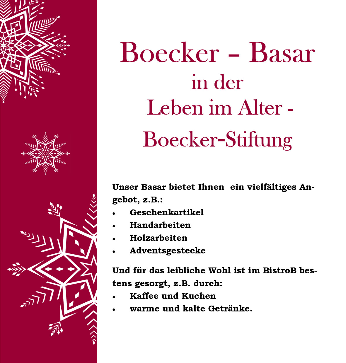 Der diesjährige Boecker-Basar bei Leben im Alter findet am 21. November 2025 von 14-17 Uhr statt.