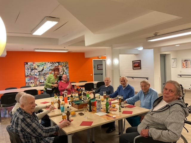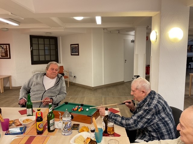 Jeden Monat treffen sich die Bewohner von Leben im Alter zum Männerstammtisch. Bei kalten Getränken und Knabbergebäck wird geplaudert und gespielt. Beliebt sind immer die verschiedensten Kartenspiele. Beim letzten Treffen versuchten sich die Herren beim Tischbillard und hatten großen Spaß daran.